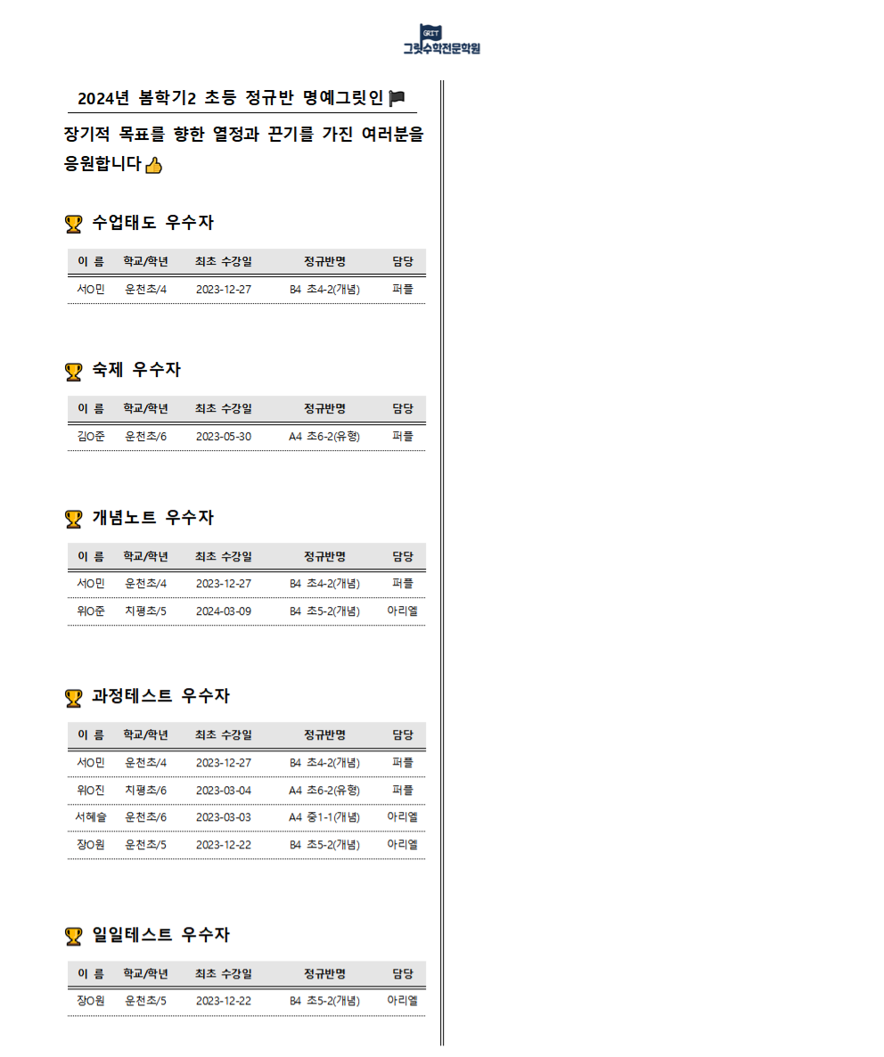❤ 그릿수학전문학원 1년 전 그릿수학전문학원 2024년 봄학기2 정규반 초등부 명예그릿인 🏆 명예그릿인 초등부 ※ 장기적 목표를 향한 열정과 끈기를 가진 여러분을 응원합니다! 👏👏👍👍 첨부파일: 2 명예그릿인_20240628001.png (167.5KB) 다운로드: 9 초등부_봄학기2.jpg (626.5KB) 다운로드: 6