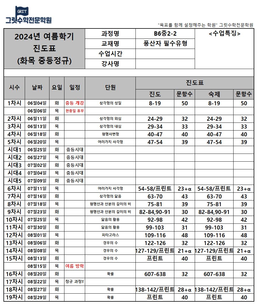| B6 중2-2유형(루시) | 📢 B6 중2-2유형(루시) 수업 교재 및 진도표 : 풍산자 필수유형 |