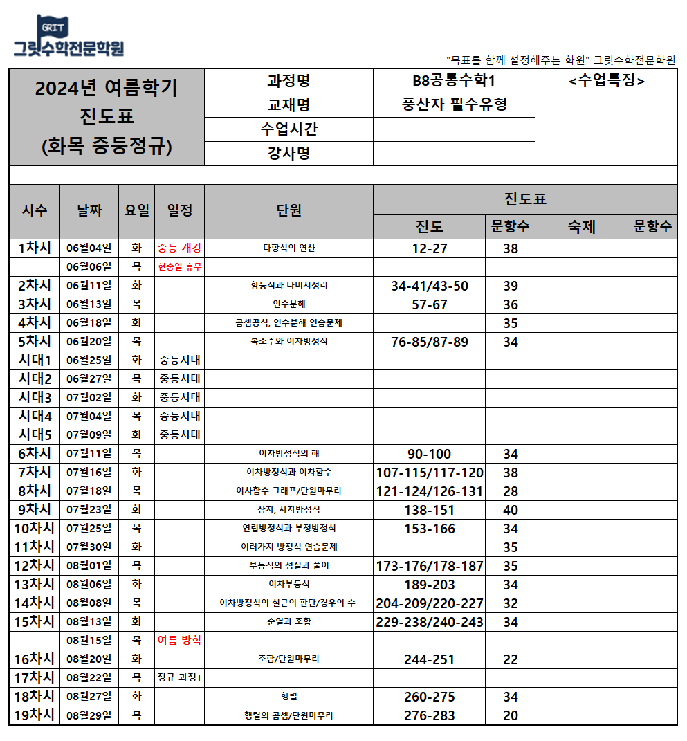 공지 📢 B8 공통수학1개념(루시) 수업 교재 및 진도표 : 풍산자 필수유형
